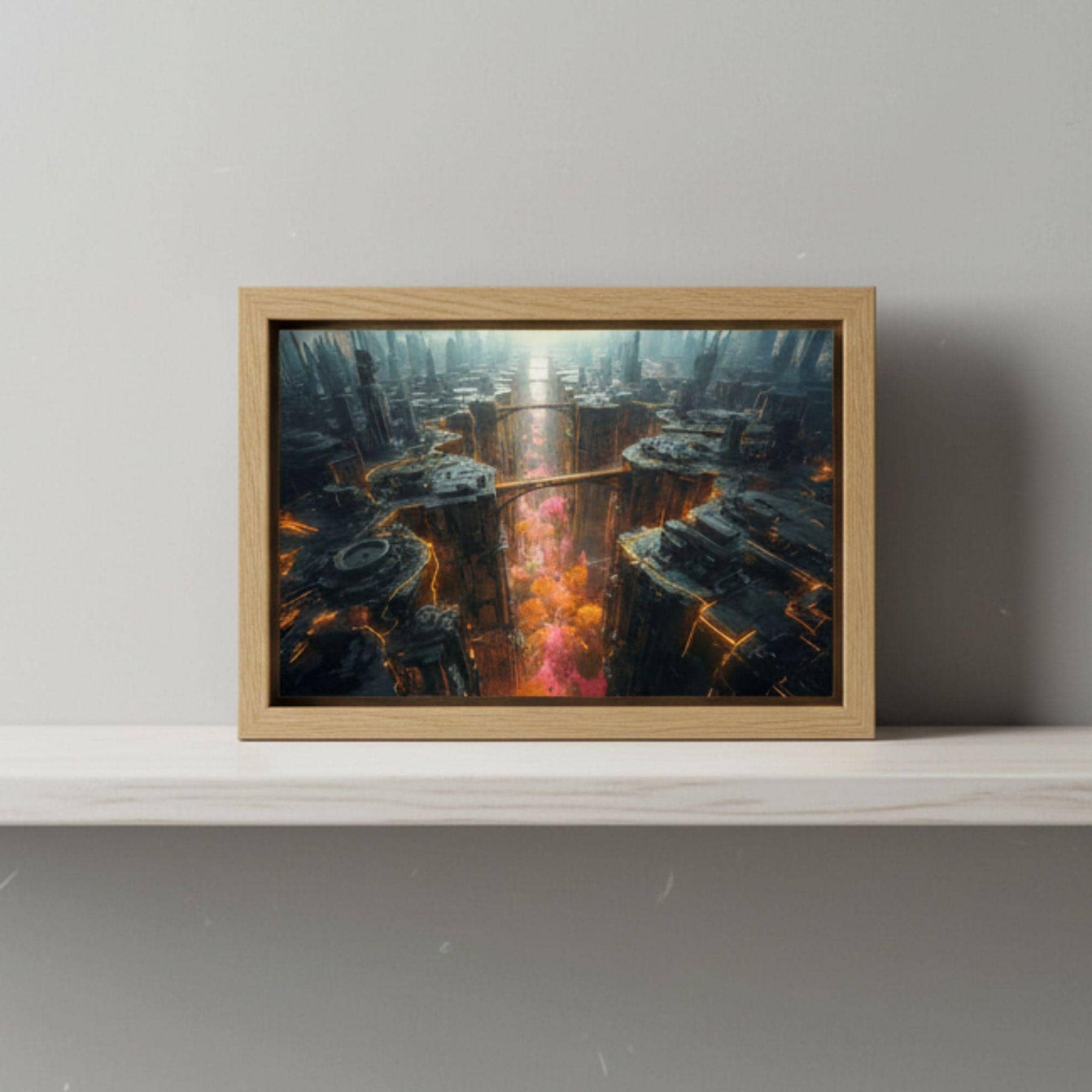 A breathtaking cyberpunk cityscape wall art print featuring neon-lit megastructures over a glowing pink forest canyon. Premium canvas or art print.
