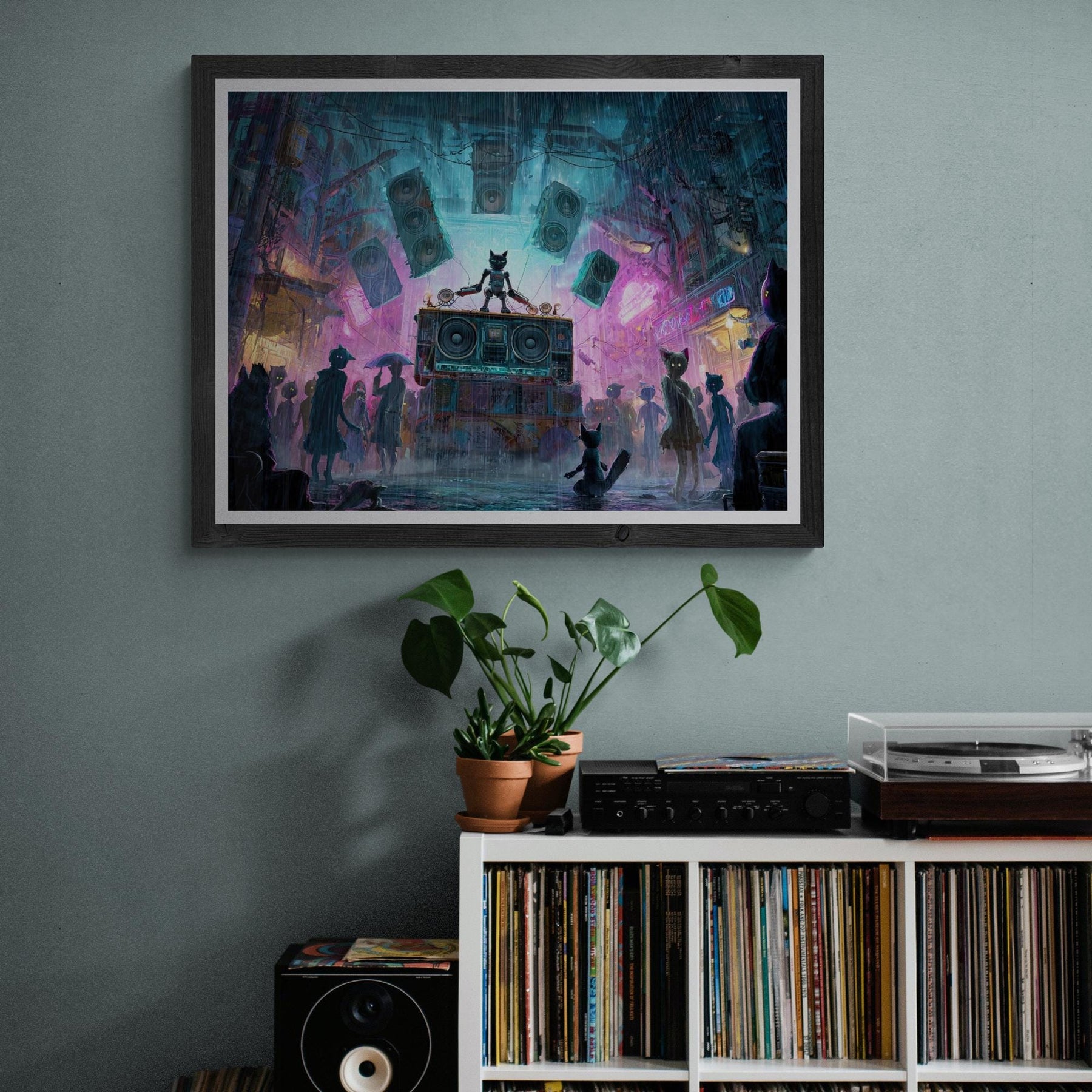 A Cyberpunk music master art print featuring an anthropomorphic cat DJ with cybernetic arms, glowing neon speakers, and surreal mannequins. Cyberpunk wall art in 12x16, 16x20, 18x24, 24x36.