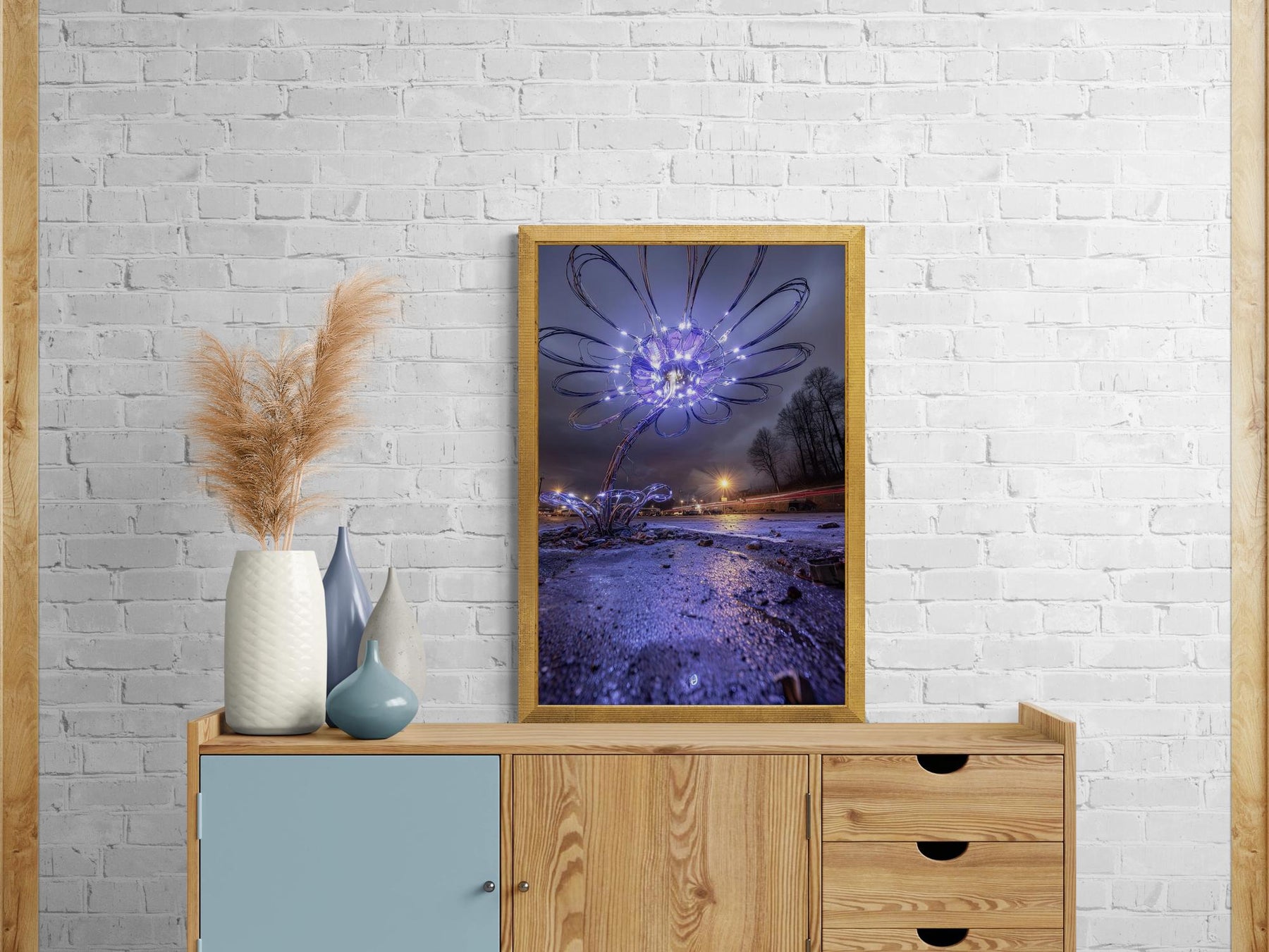 Illuminate your space with this mesmerizing glowing flower wall art — a luminous wire sculpture blooming in the night, radiating soft violet light across a moody, cinematic landscape. It’s atmospheric, surreal, and impossible to ignore.