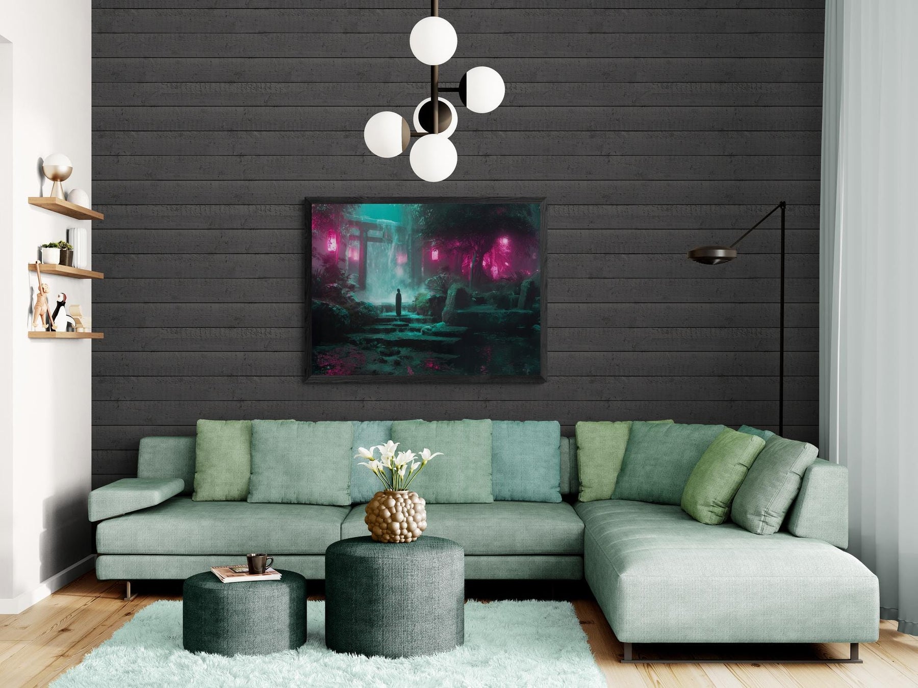 Step into a dreamlike scene where a glowing waterfall pours beneath lanterns, casting neon light through the mist. This surreal cyberpunk shrine canvas blends futuristic neon color with spiritual stillness — a piece that transforms any wall into a story. Perfect for fans of cyberpunk, dreamcore, and surreal landscapes. This piece creates a meditative yet futuristic vibe, making it ideal for bedrooms, gaming rooms, or creative studios.