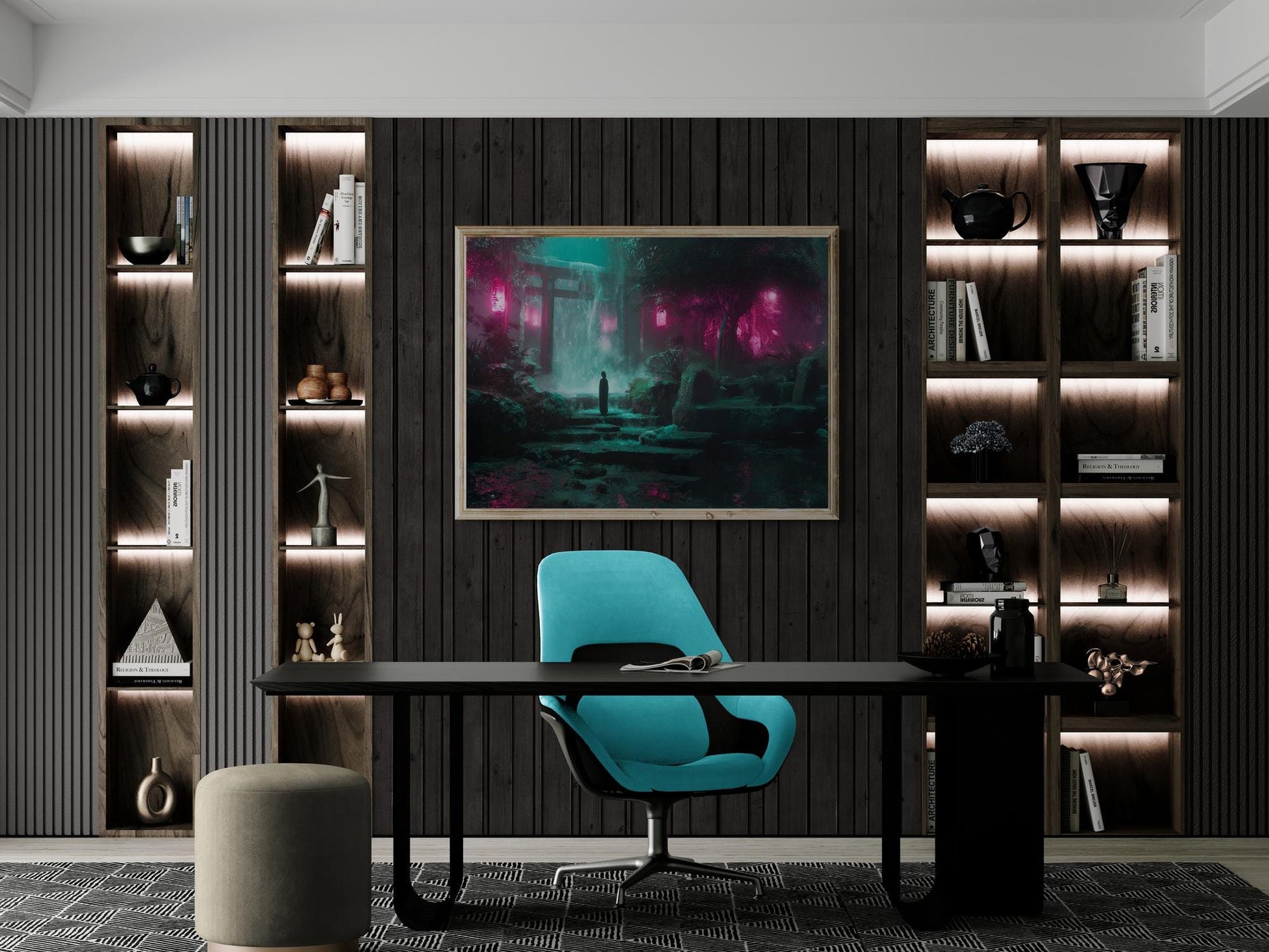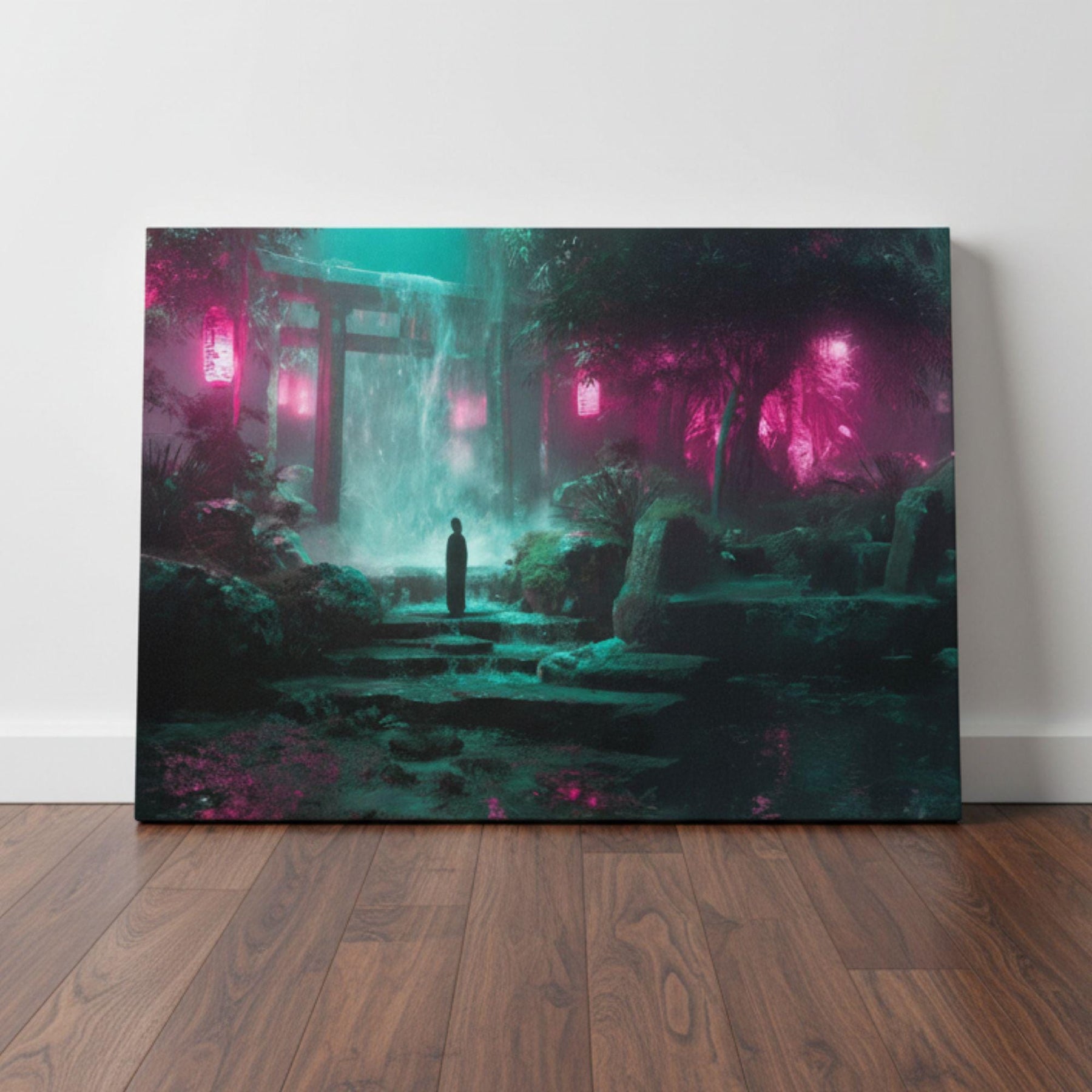 Add this neon waterfall shrine canvas to your wall today — a luminous blend of cyberpunk energy and serene fantasy.