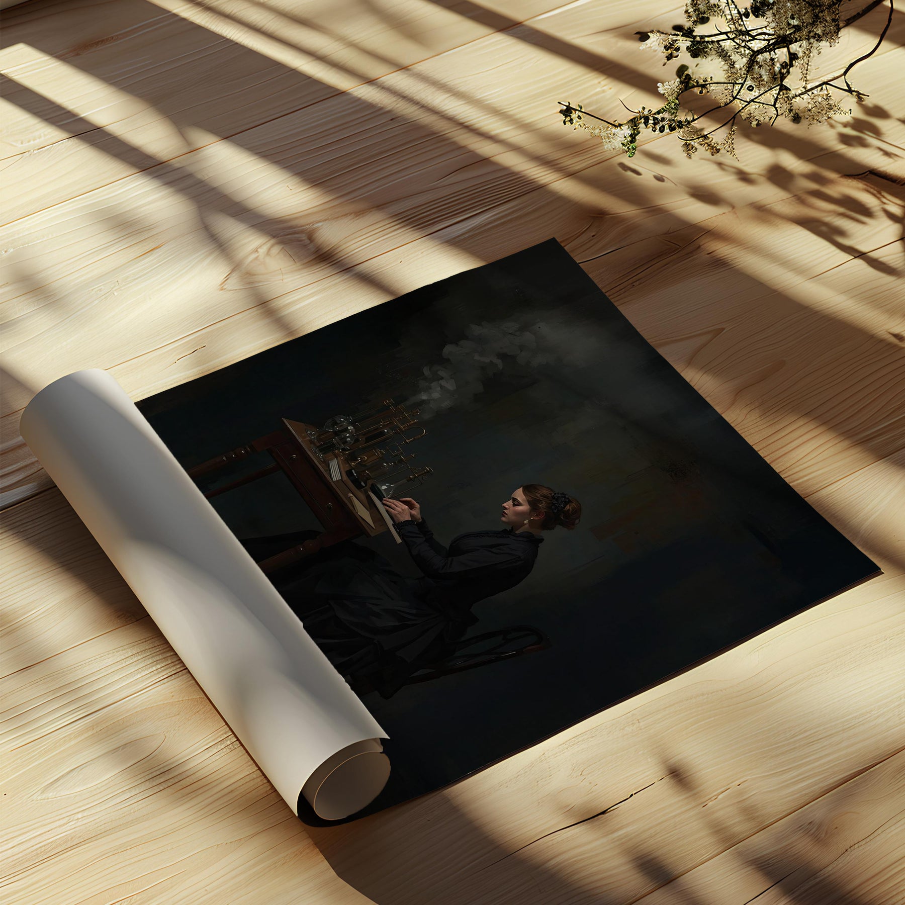 In a dimly lit study filled with delicate glass instruments and handwritten notes, a Victorian scholar records her latest discovery. This dark academia artwork captures the quiet intensity of scientific curiosity, where knowledge, experimentation, and patience shape the pursuit of hidden truths.
