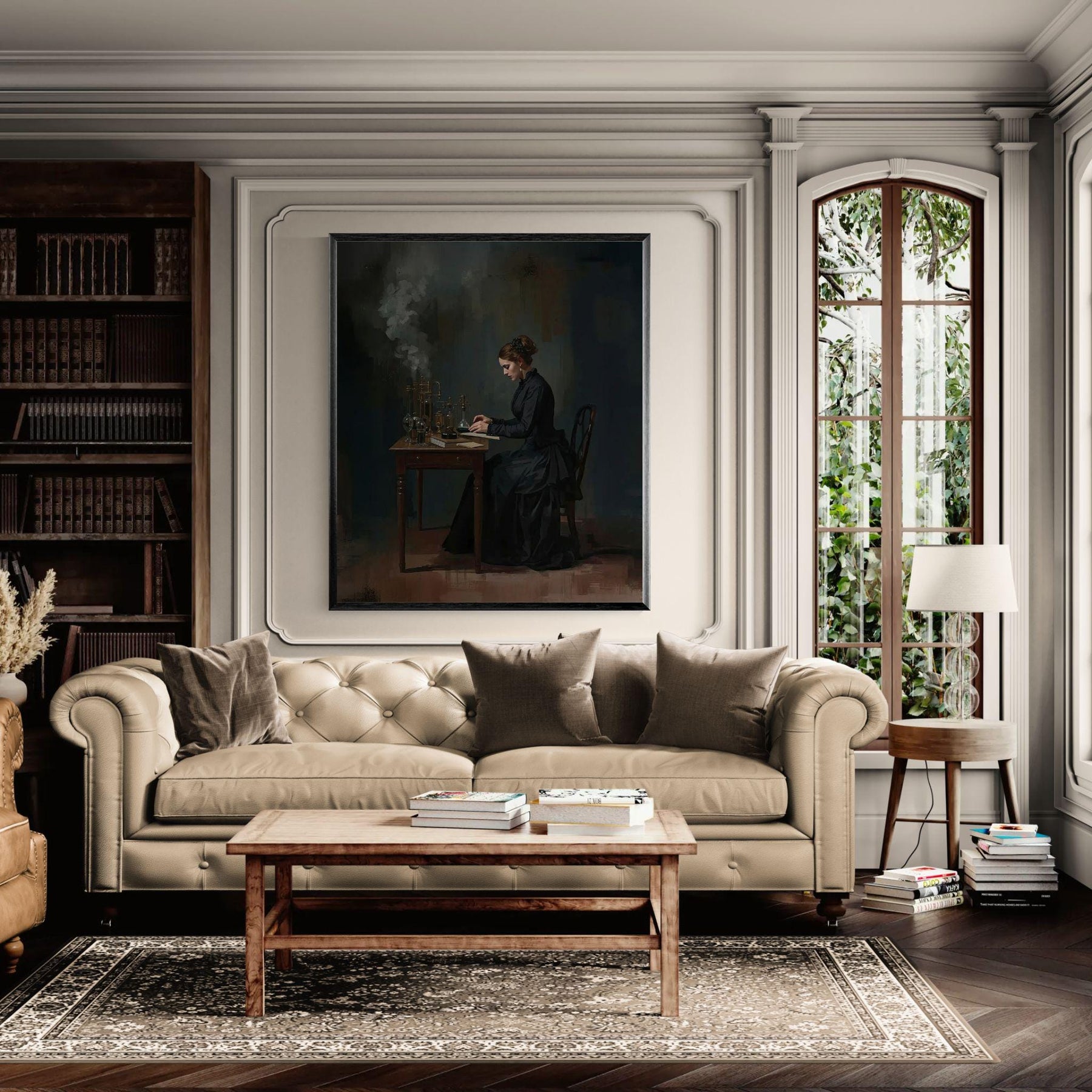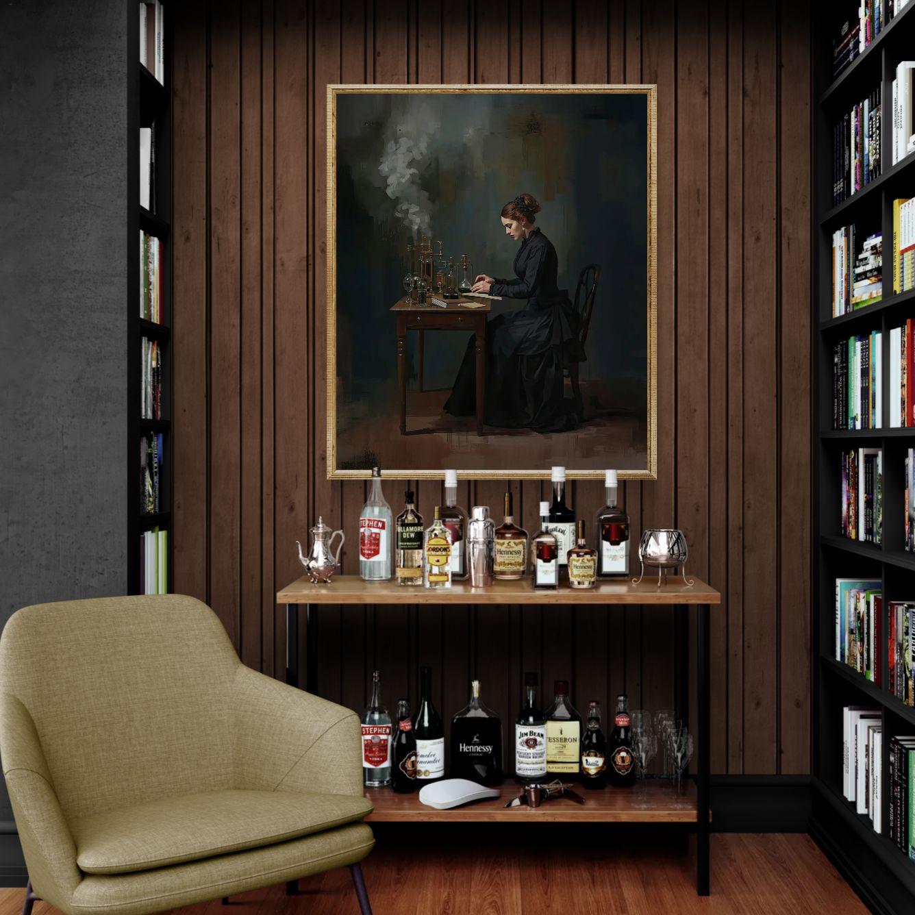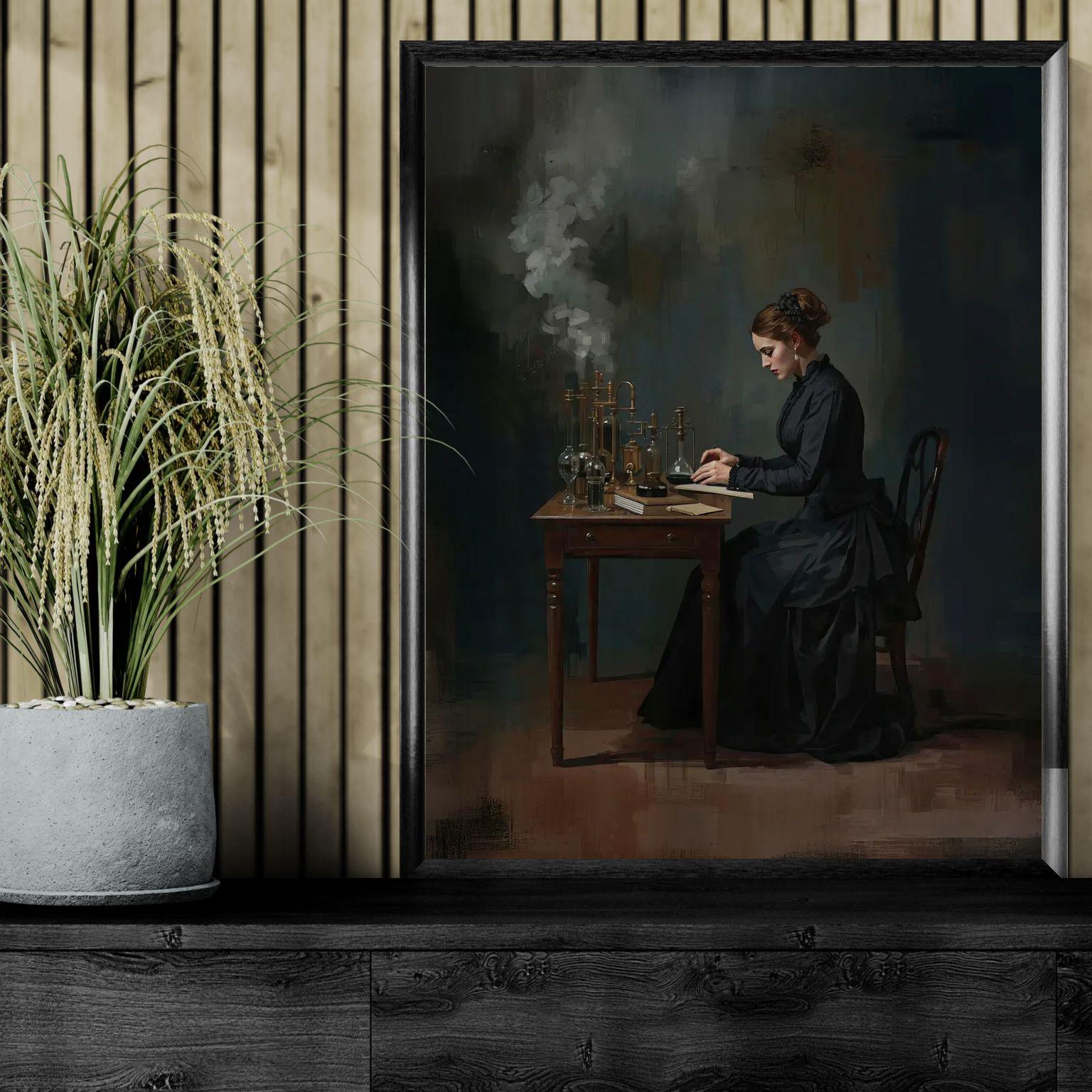 Victorian alchemist study wall art capturing a quiet moment of scientific discovery within a moody dark academia scientist setting. Surrounded by antique laboratory instruments and handwritten notes, this atmospheric painting evokes the mystery of early scholarship and alchemy.