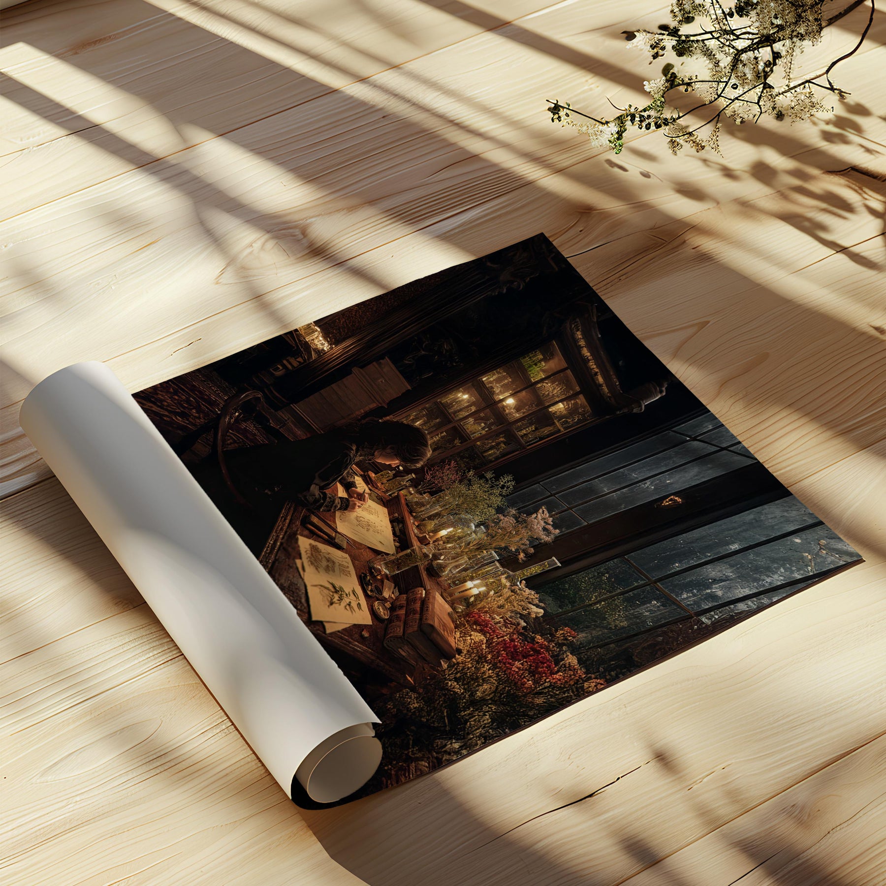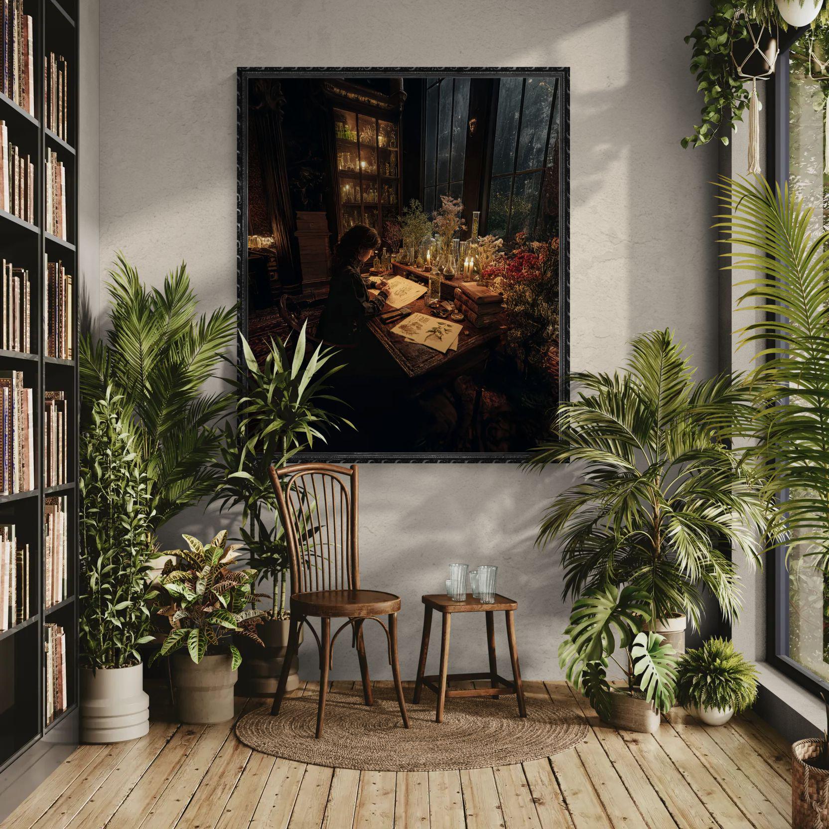 Victorian botanical study wall art capturing a quiet moment of herbal scholarship surrounded by dried plants, glass bottles, and candlelight. This dark academia artwork evokes the mysterious beauty of antique apothecaries and botanical research.