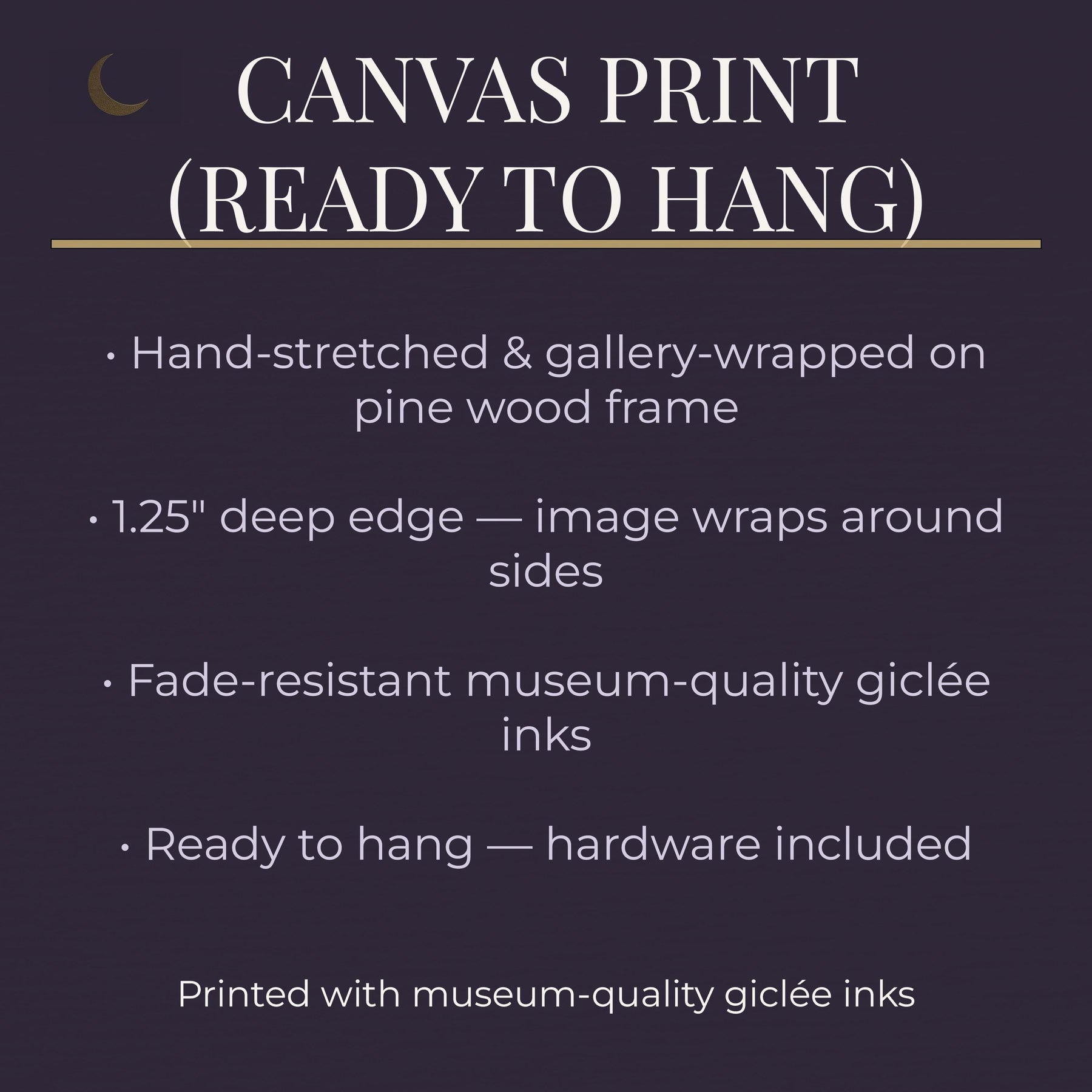 • Hand-stretched and Gallery-wrapped on pine wood frame - 1.25" edge (Image wraps around edge), ready to hang