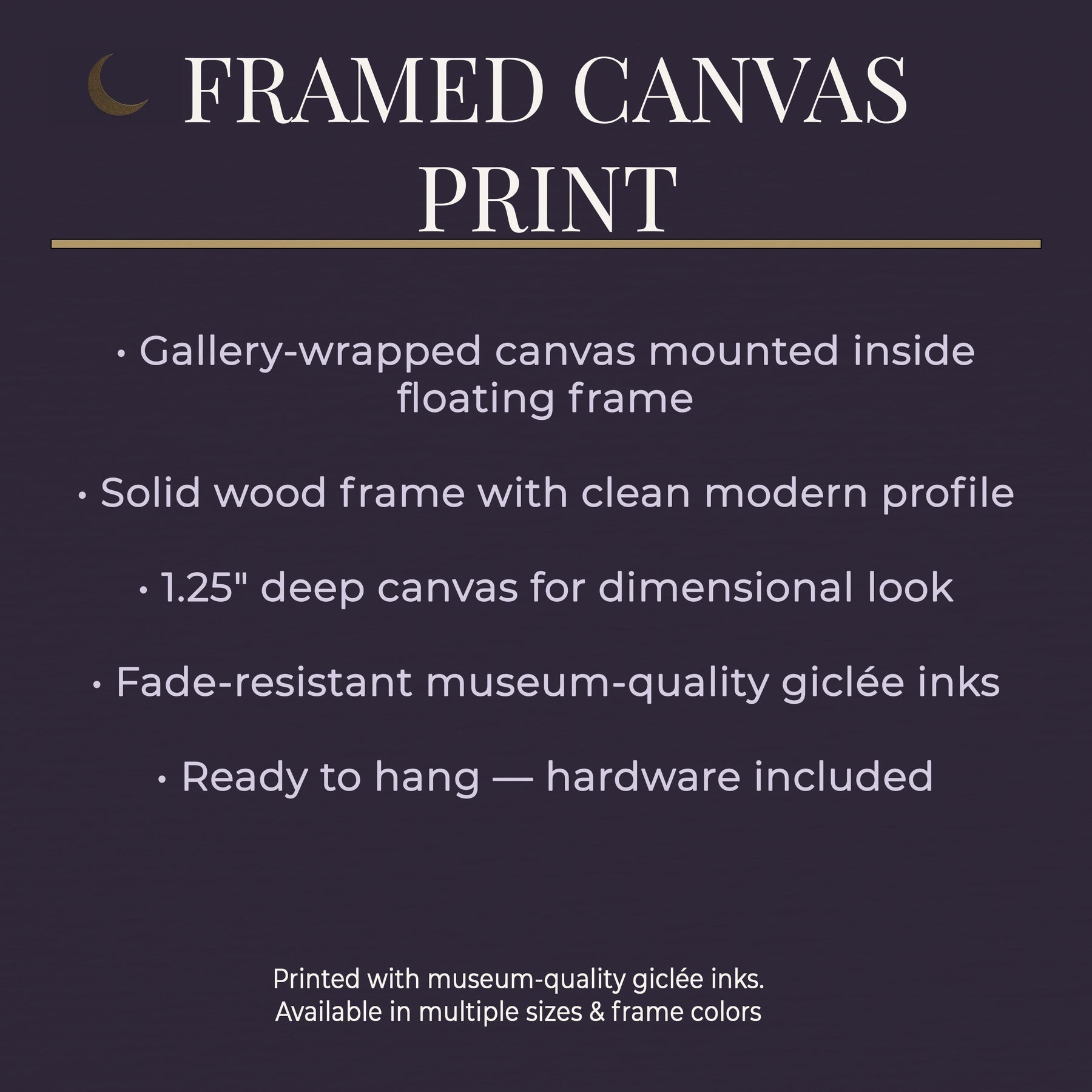 • Gallery-wrapped canvas professionally framed in a sleek matte black floating frame