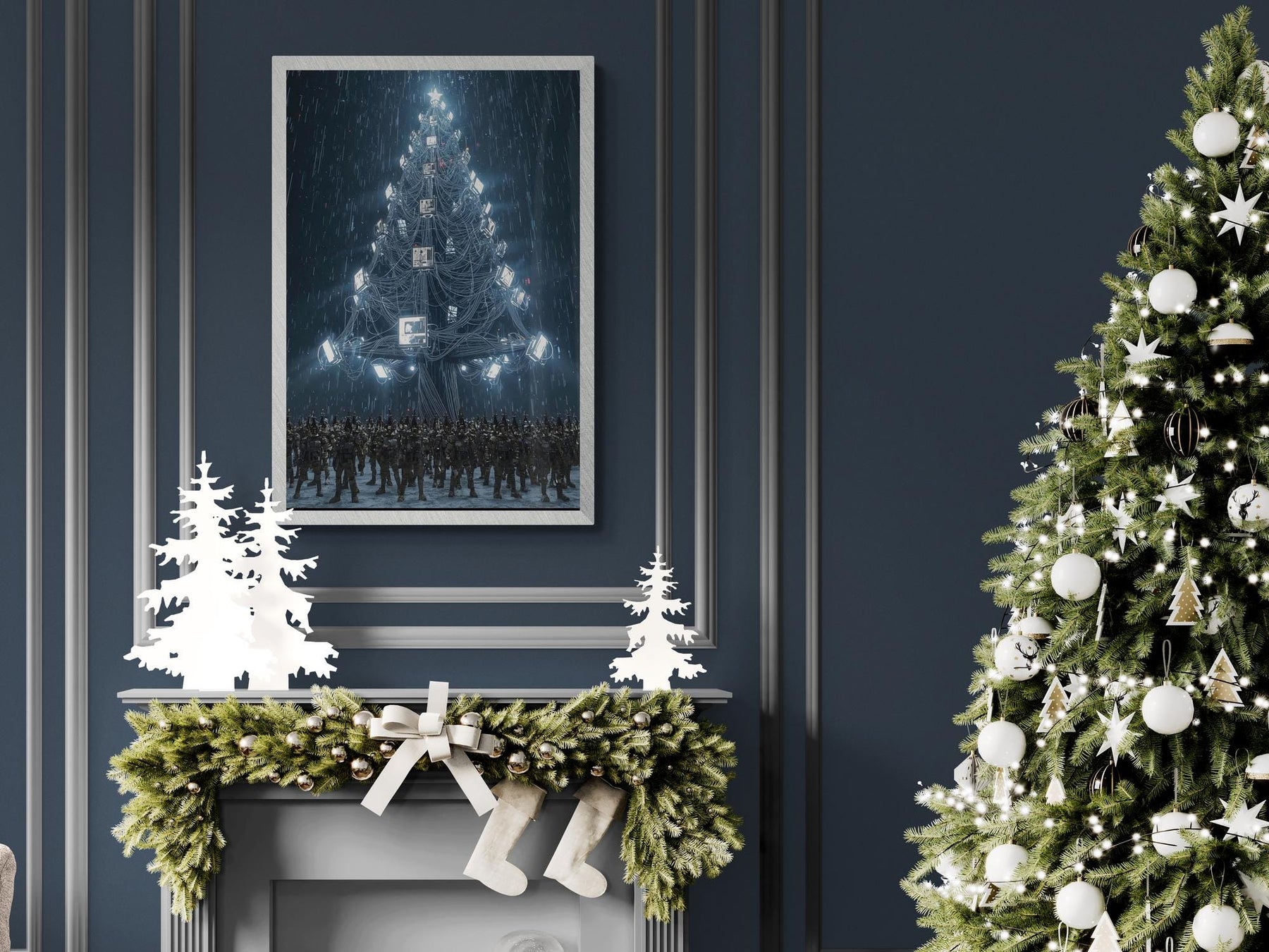 In a frozen world of steel and signal, the Christmas spirit takes on a haunting new form. “Digital Winter Rebellion” captures a futuristic vision — a towering cybernetic tree pulsing with light, surrounded by silent ranks under digital snow.