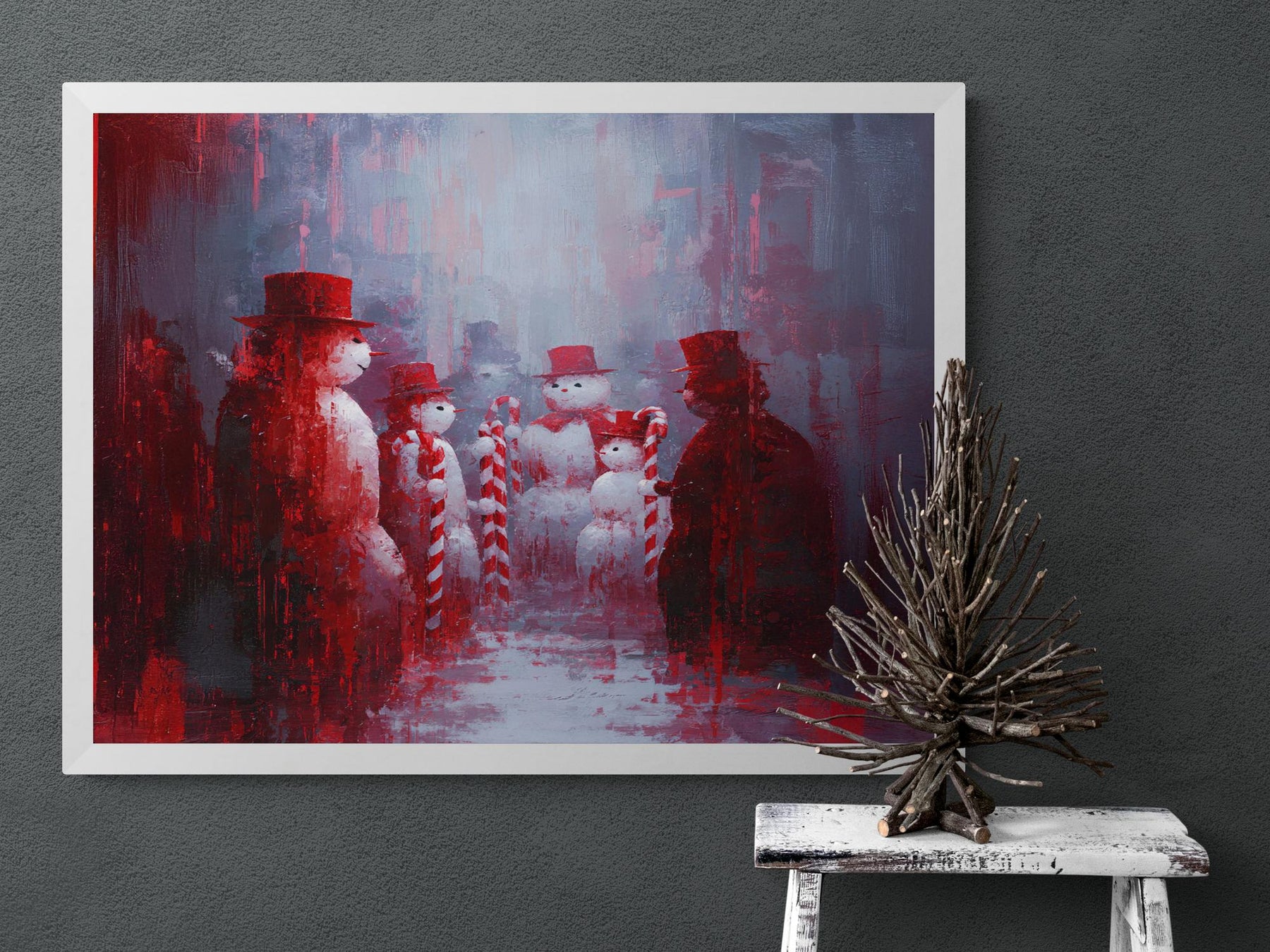 Step into a surreal winter world with this striking artwork of snowmen in red hats, gathered with candy canes under a dreamy holiday sky. A bold Christmas statement piece for your home.