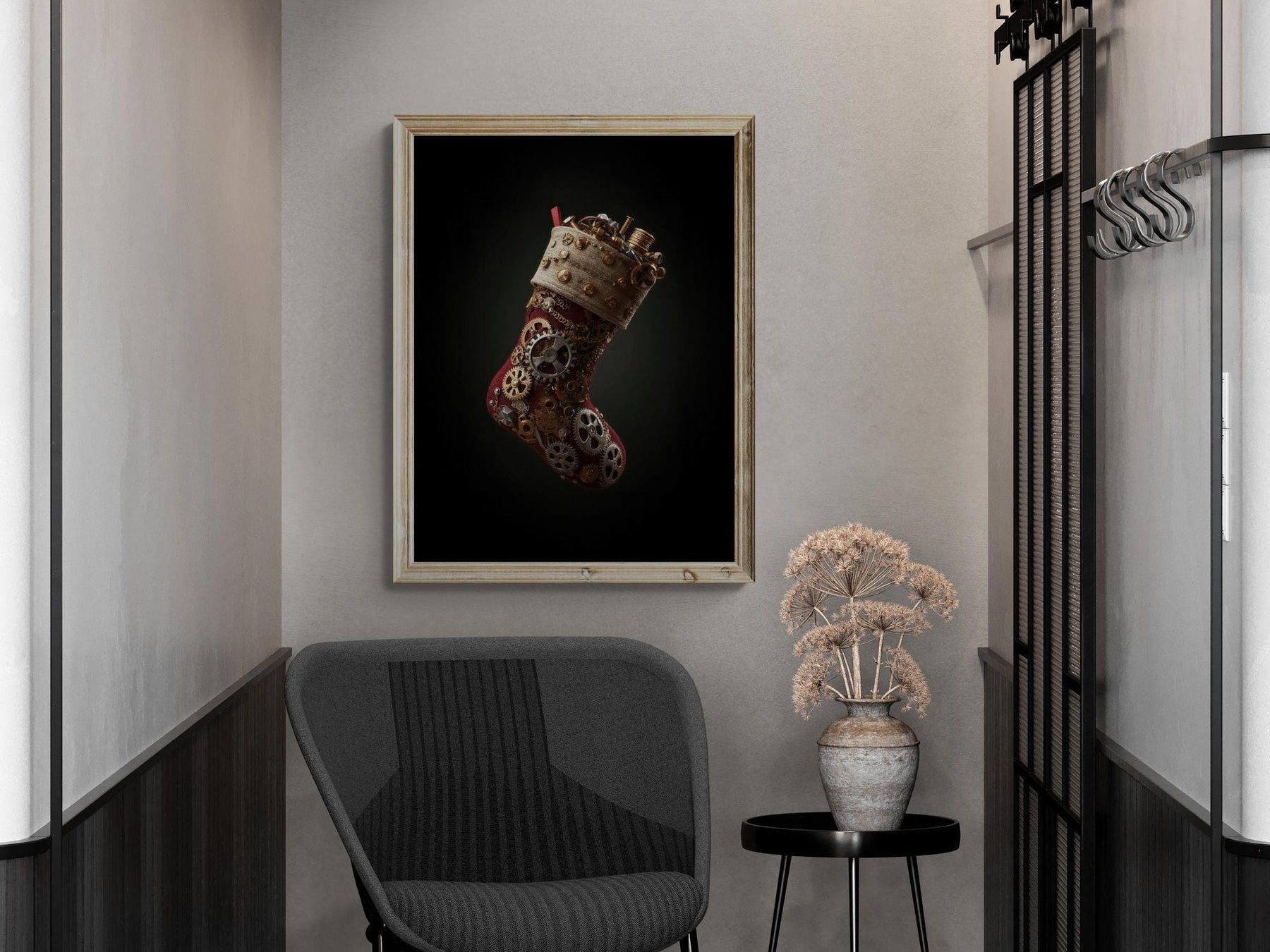 Celebrate the season with a twist of fantasy. This steampunk Christmas stocking wall art blends vintage brass gears and Victorian whimsy — perfect for gothic or fantasy holiday decor lovers.