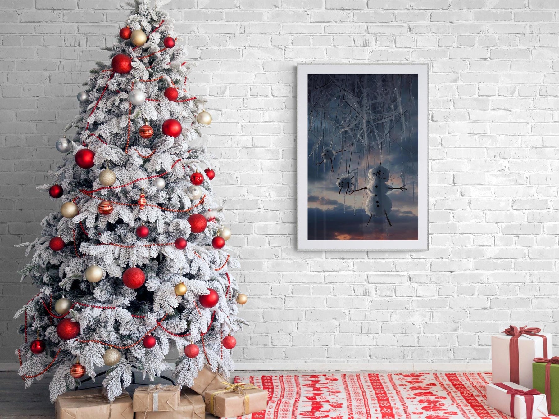 Step into a surreal winter dream where snowmen dangle like marionettes from frozen icicles against a dramatic twilight sky. This poster is the perfect blend of eerie and enchanting, making it a striking piece for weirdcore, dark fantasy, and alternative holiday decor lovers. This artwork captures the strange magic of winter nights — playful yet unsettling. The dangling snowmen and jagged icicles blur the line between holiday cheer and dreamlike unease, evoking both wonder and mystery.
