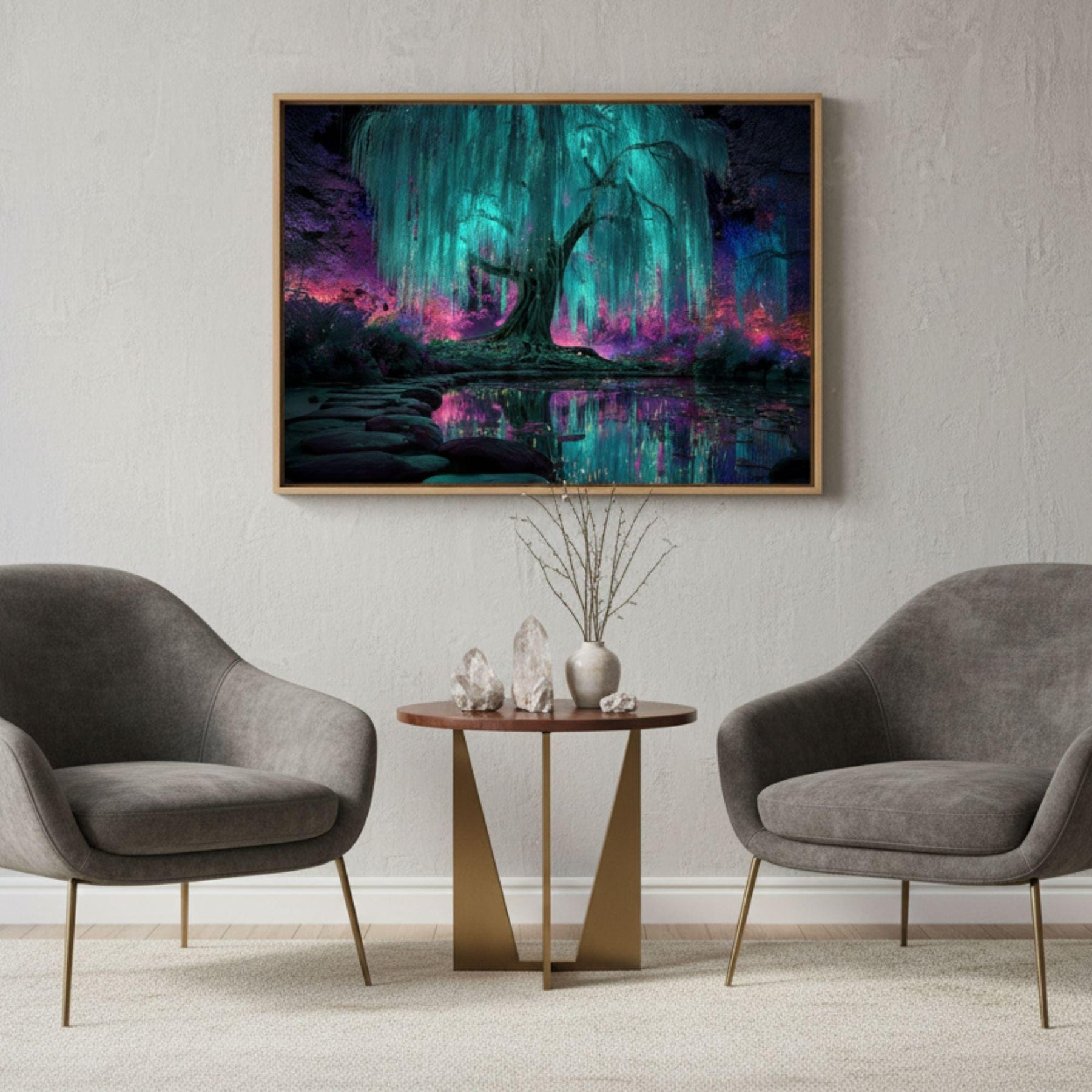 Step into a glowing dreamscape beneath a bioluminescent willow tree—an enchanted, surreal forest scene that feels alive with magic and light. This artwork brings ethereal mood, luminous color, and otherworldly wonder to any room.