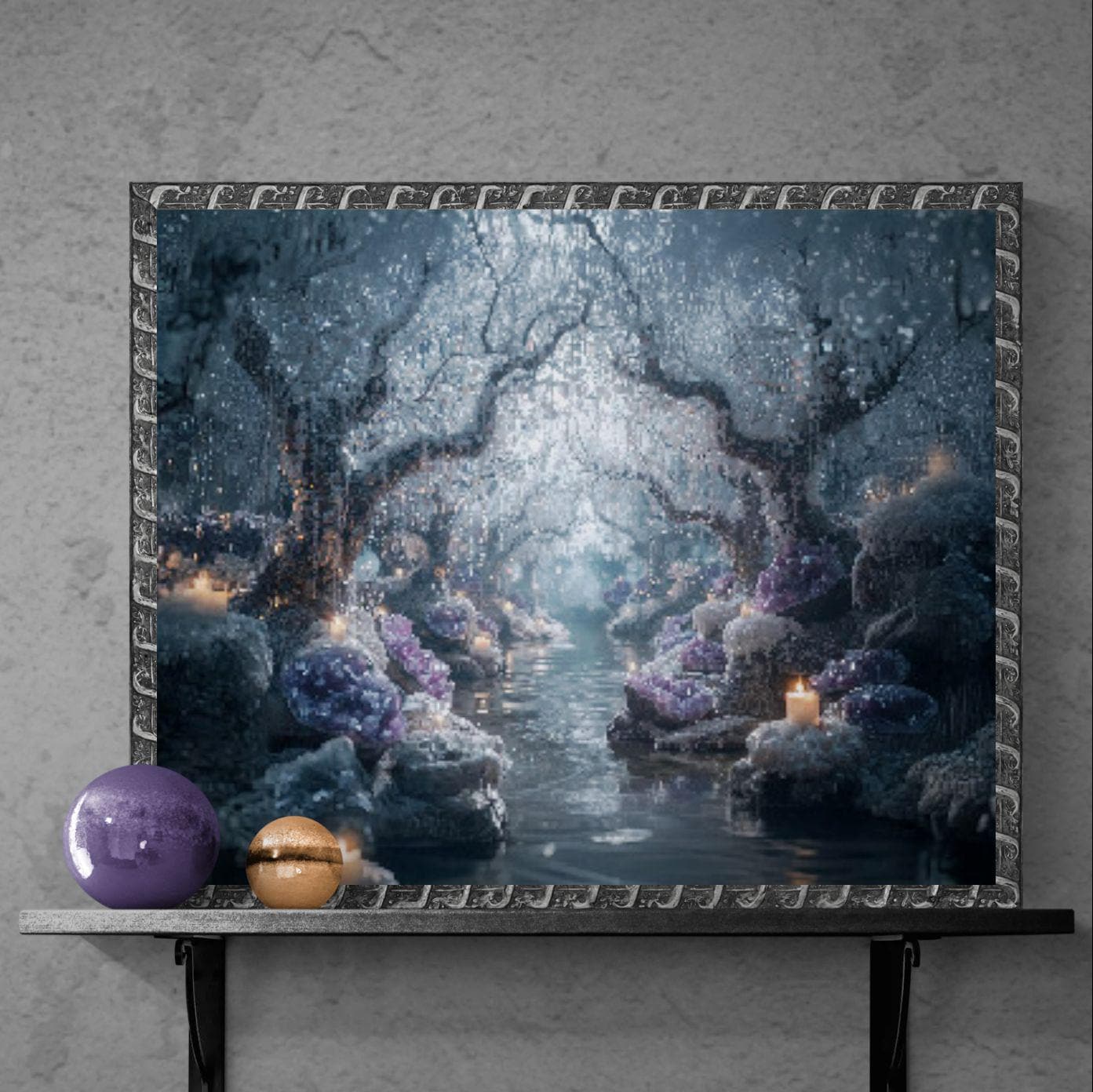 Magical enchanted forest wall art featuring glowing crystals, candles, and icy trees over a serene river. A dreamy fantasy print for peaceful, mystical décor.