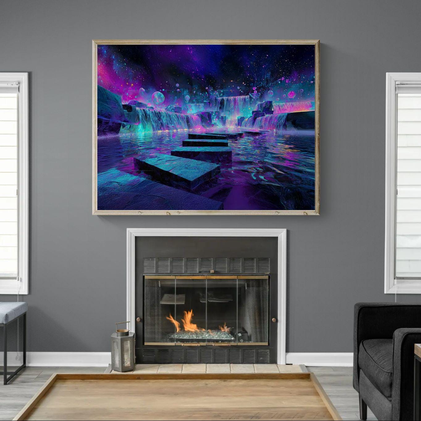 Fantasy waterfall wall art showcasing luminous neon pools and a surreal cosmic dreamscape designed to elevate imaginative interiors. This glowing fantasy landscape artwork creates a calming yet otherworldly atmosphere perfect for modern decor lovers.