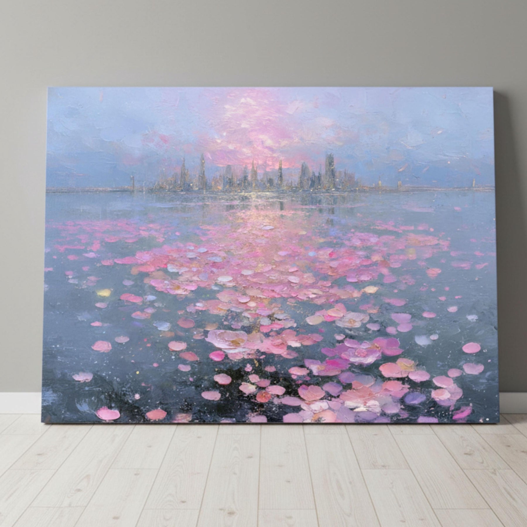 Immerse yourself in a pink dreamy fantasy wall art scene — a glowing city reflected in serene pastel waters filled with drifting pink petals. Perfect for dreamers, romantics, and art lovers.