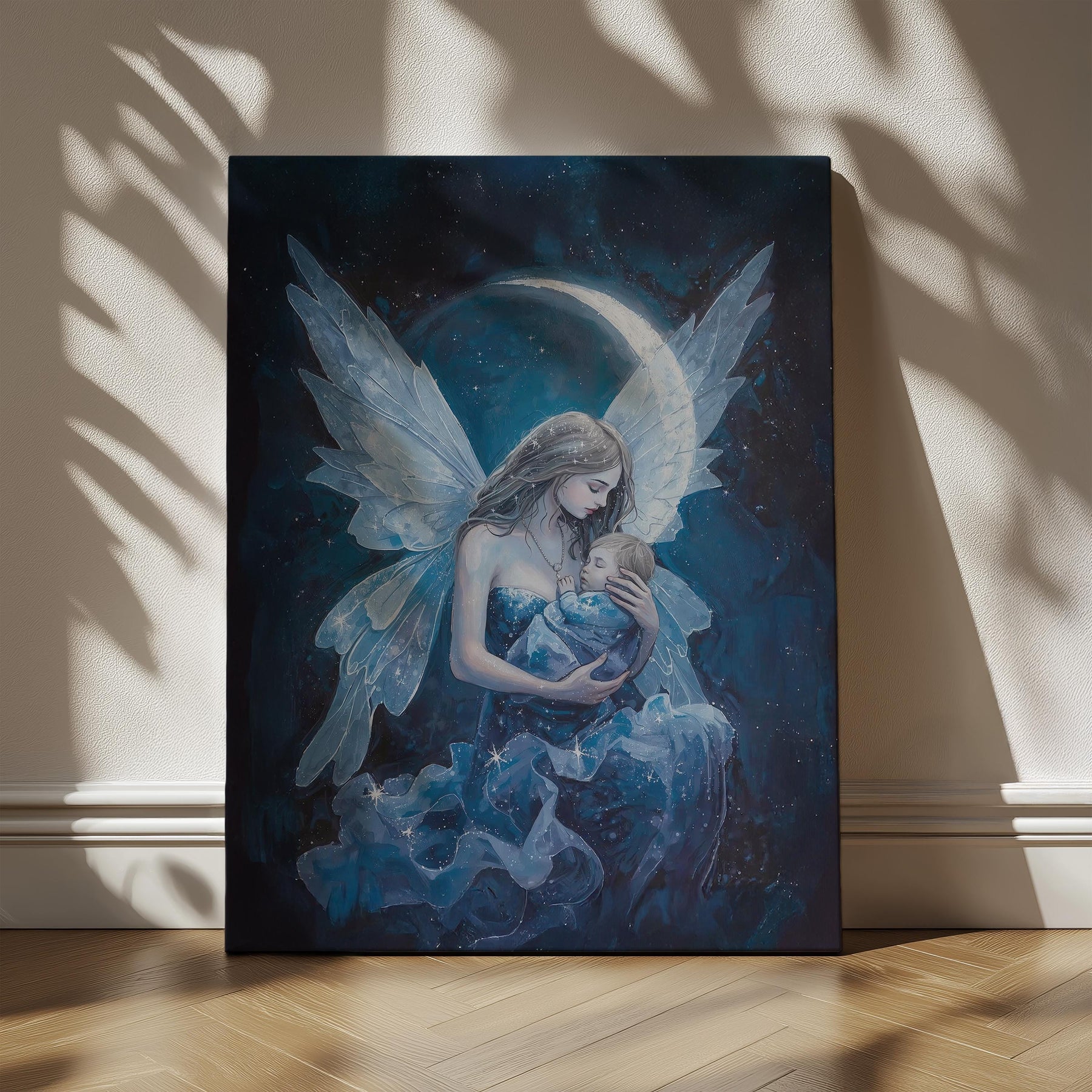 This fairy mother wall art captures a serene moment of celestial motherhood beneath a glowing moon and star-filled sky. Designed as a meaningful nursery and new mom gift, it brings comfort, protection, and gentle magic into any space.