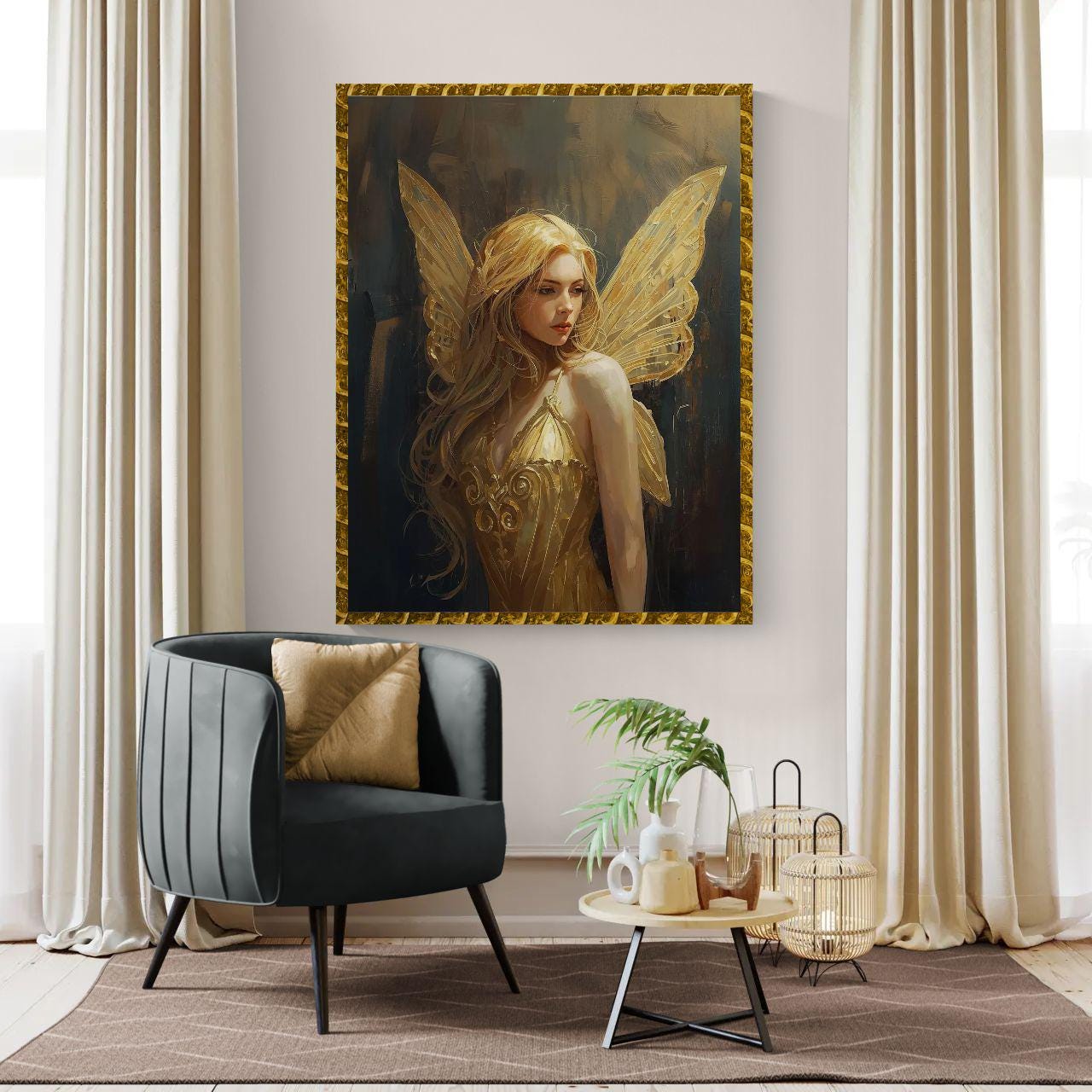 • Golden fairy wall art with soft, elegant fantasy energy