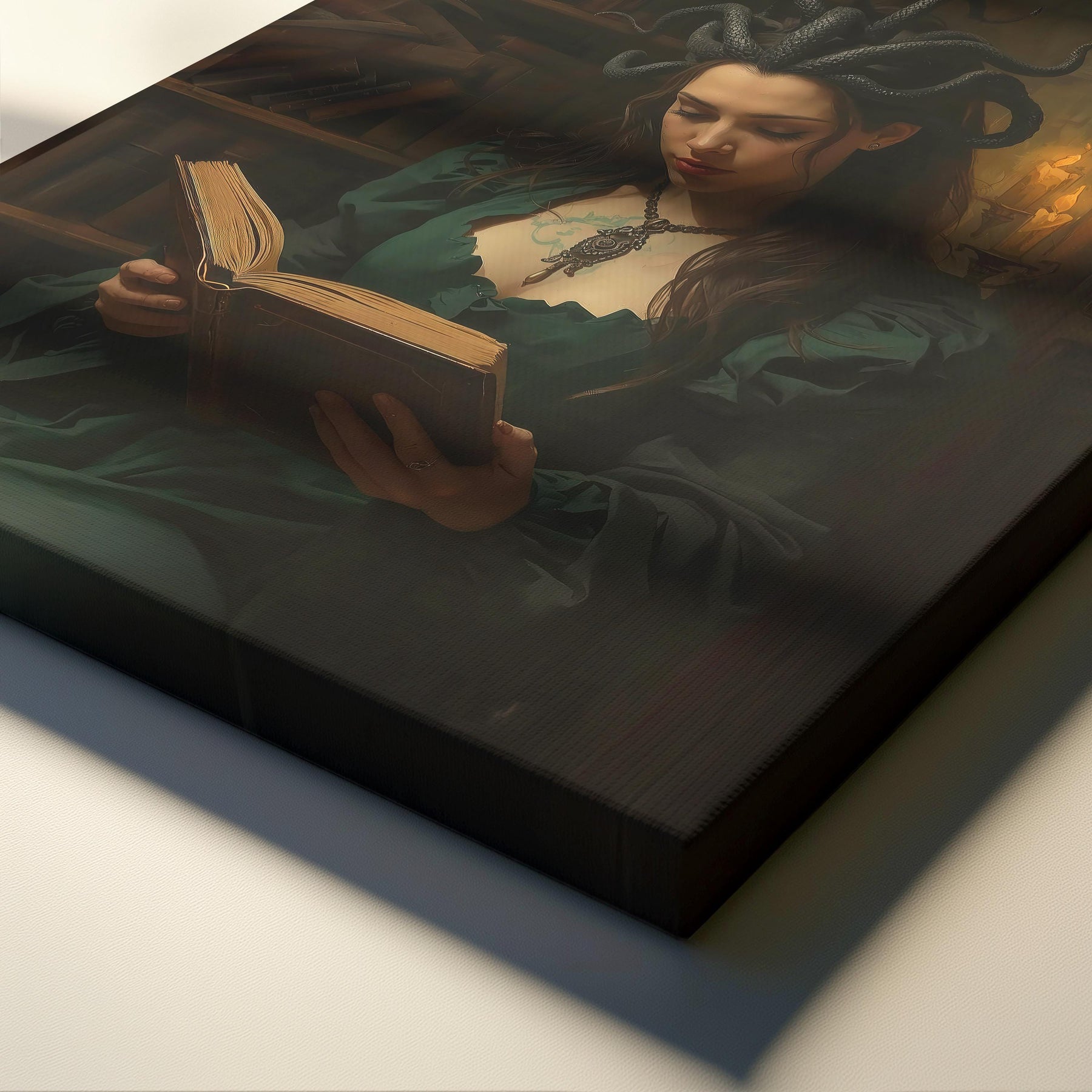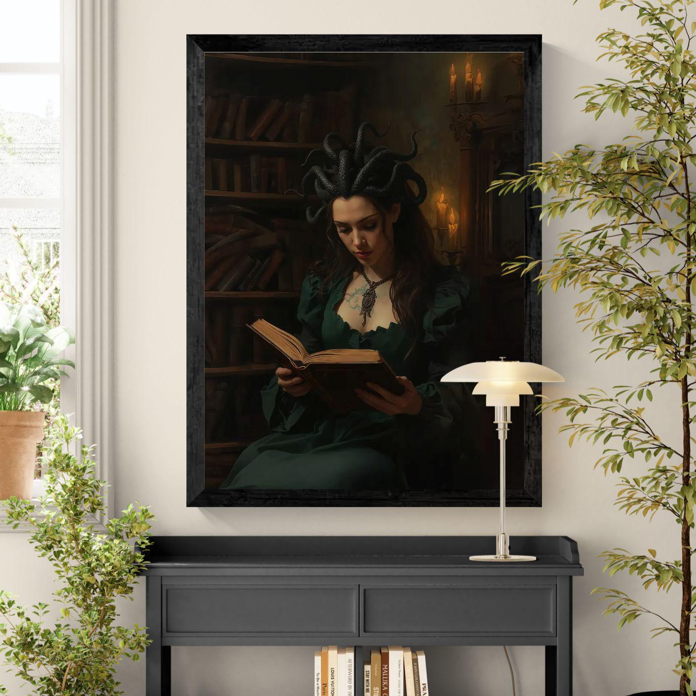 Dark academia wall art showcasing a Medusa-inspired sorceress absorbed in ancient knowledge inside a candlelit gothic library. A hauntingly beautiful fantasy artwork designed for lovers of mythology, mystery, and scholarly aesthetics.