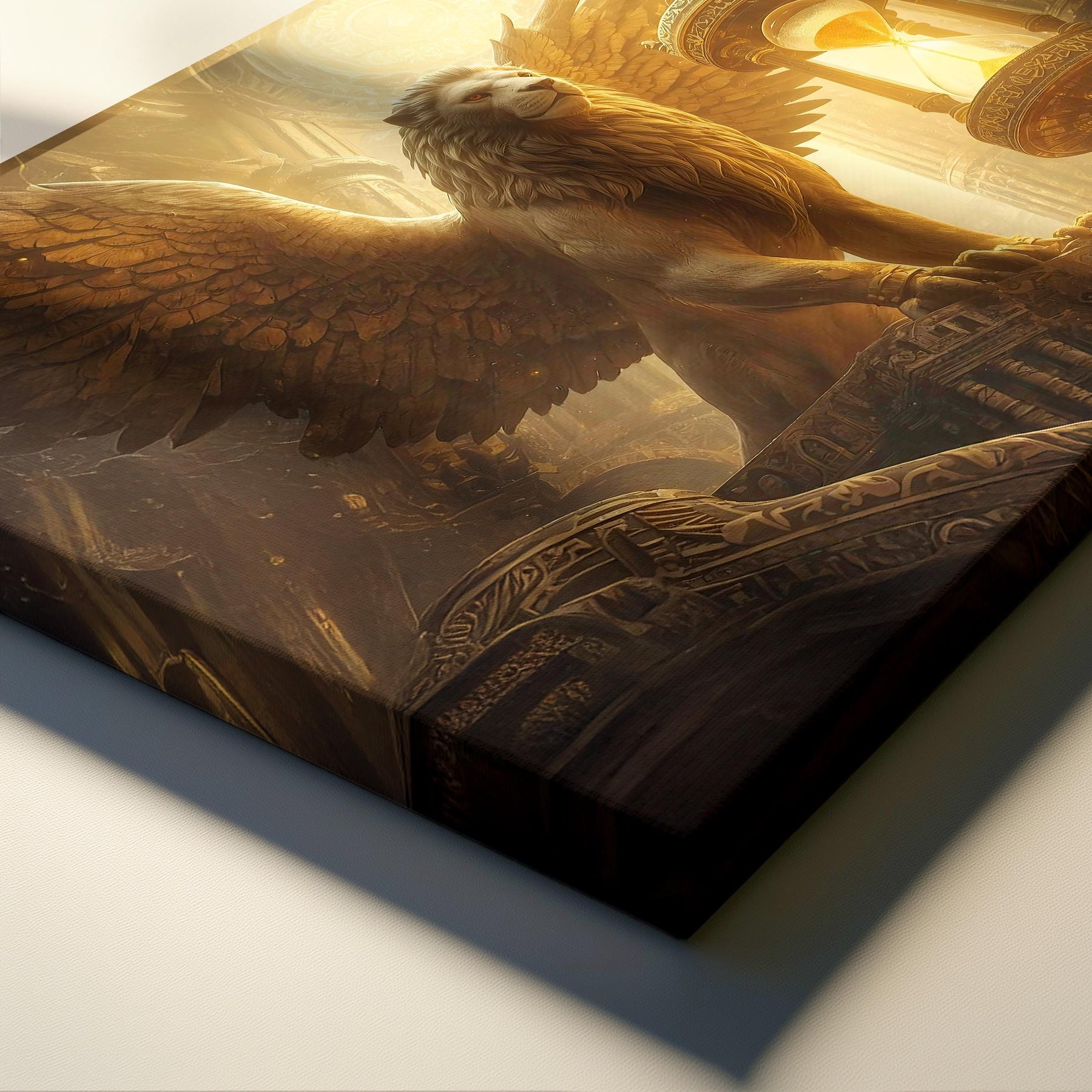 Epic mythical creature wall art featuring a powerful winged griffin guarding an ornate hourglass inside a glowing temple, symbolizing time and eternal protection