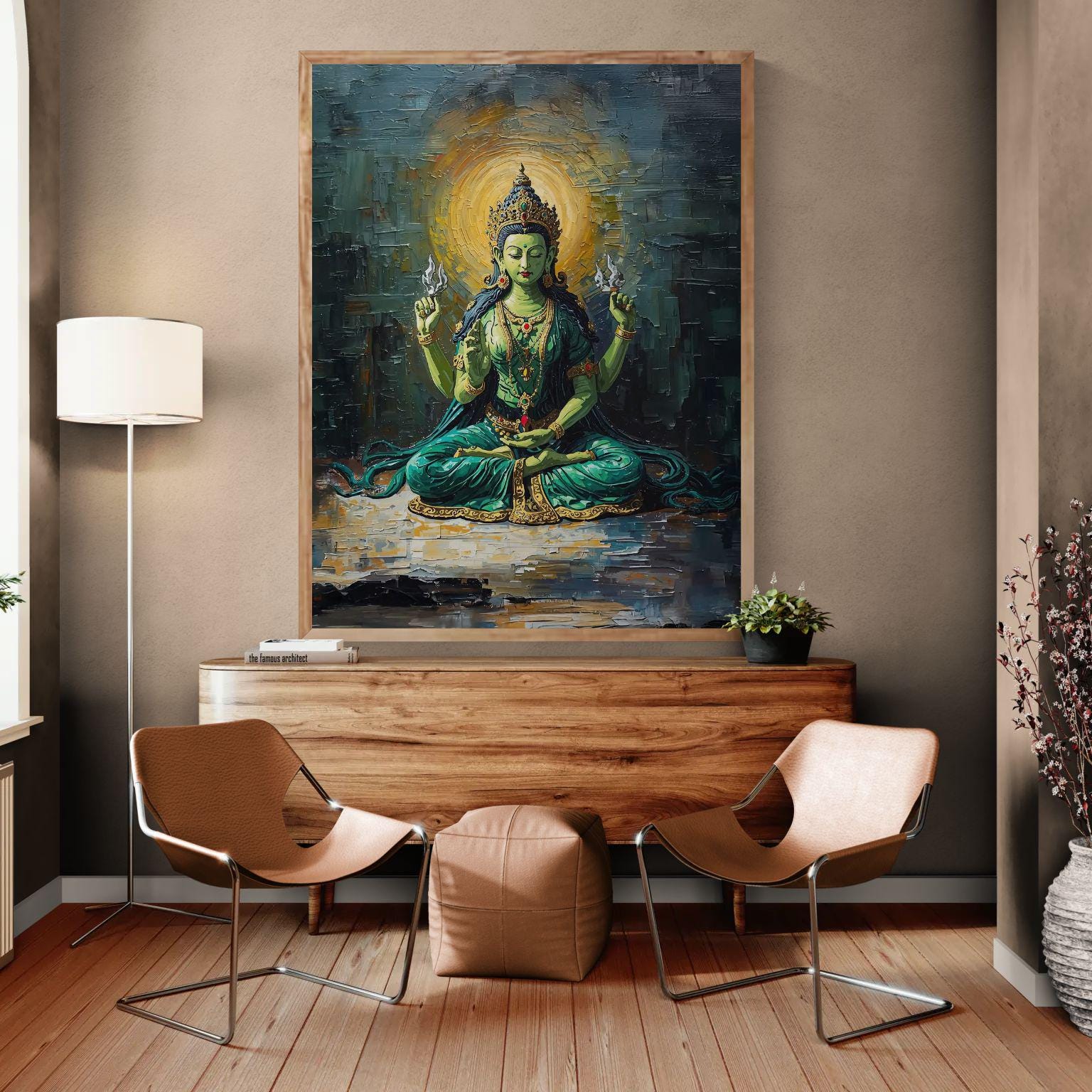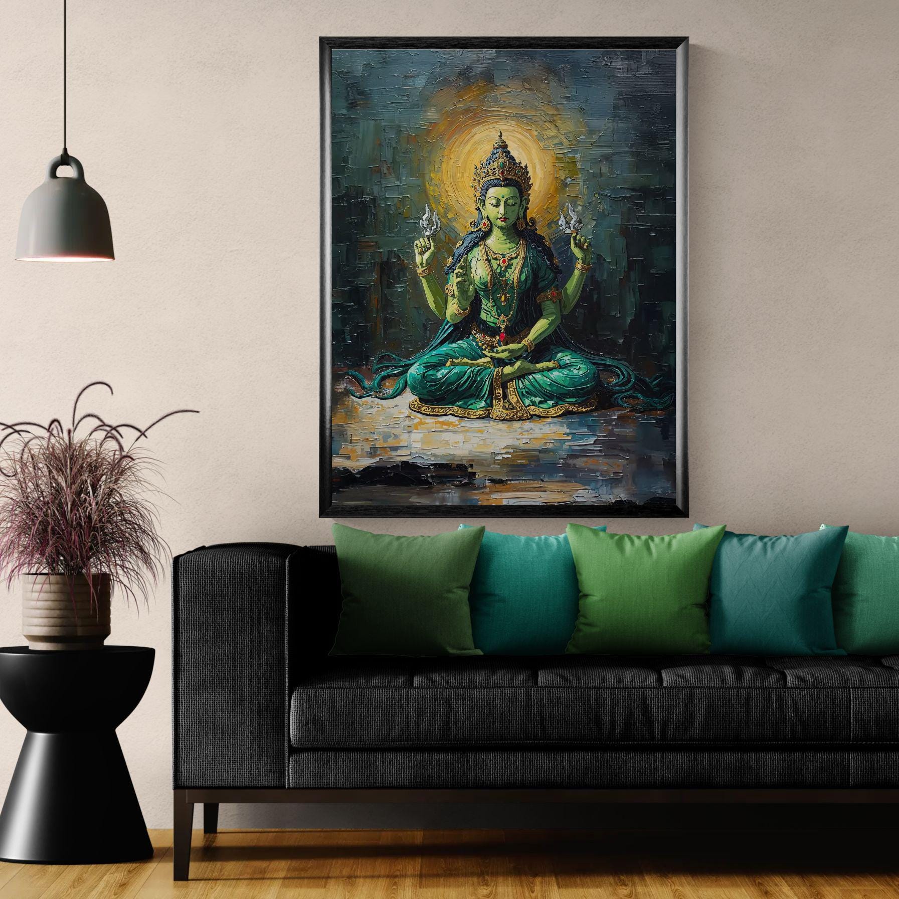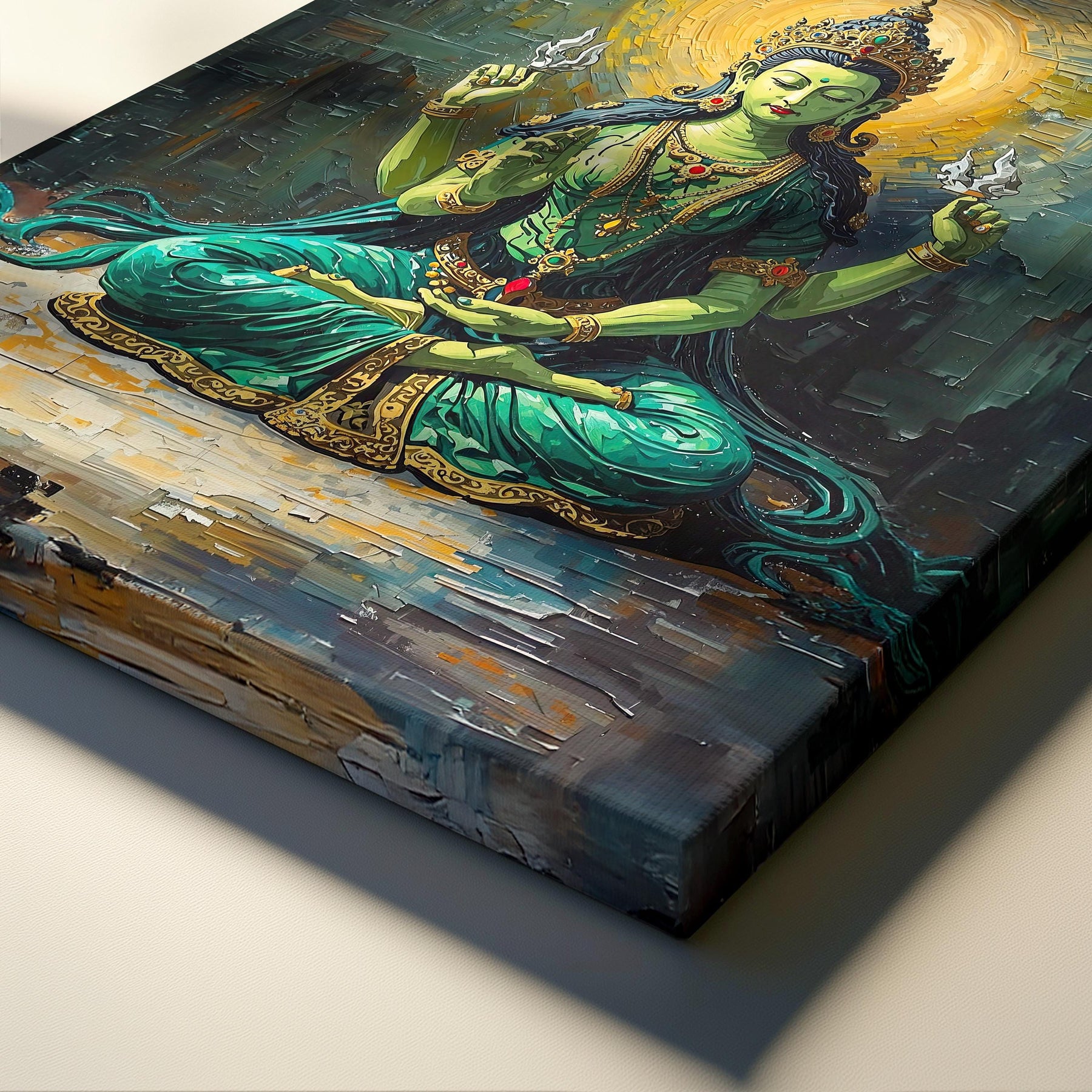 Experience the calming presence of Tara, the compassionate goddess of protection and enlightenment, captured in a luminous moment of meditation. Rich emerald tones, golden details, and painterly texture create a powerful spiritual focal point for any sacred space.