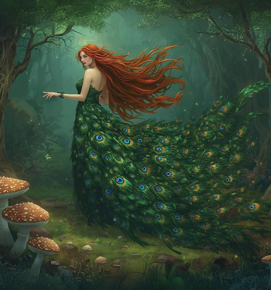 A regal peacock goddess emerges from an enchanted forest, her emerald feathered gown flowing like living magic beneath ancient trees.