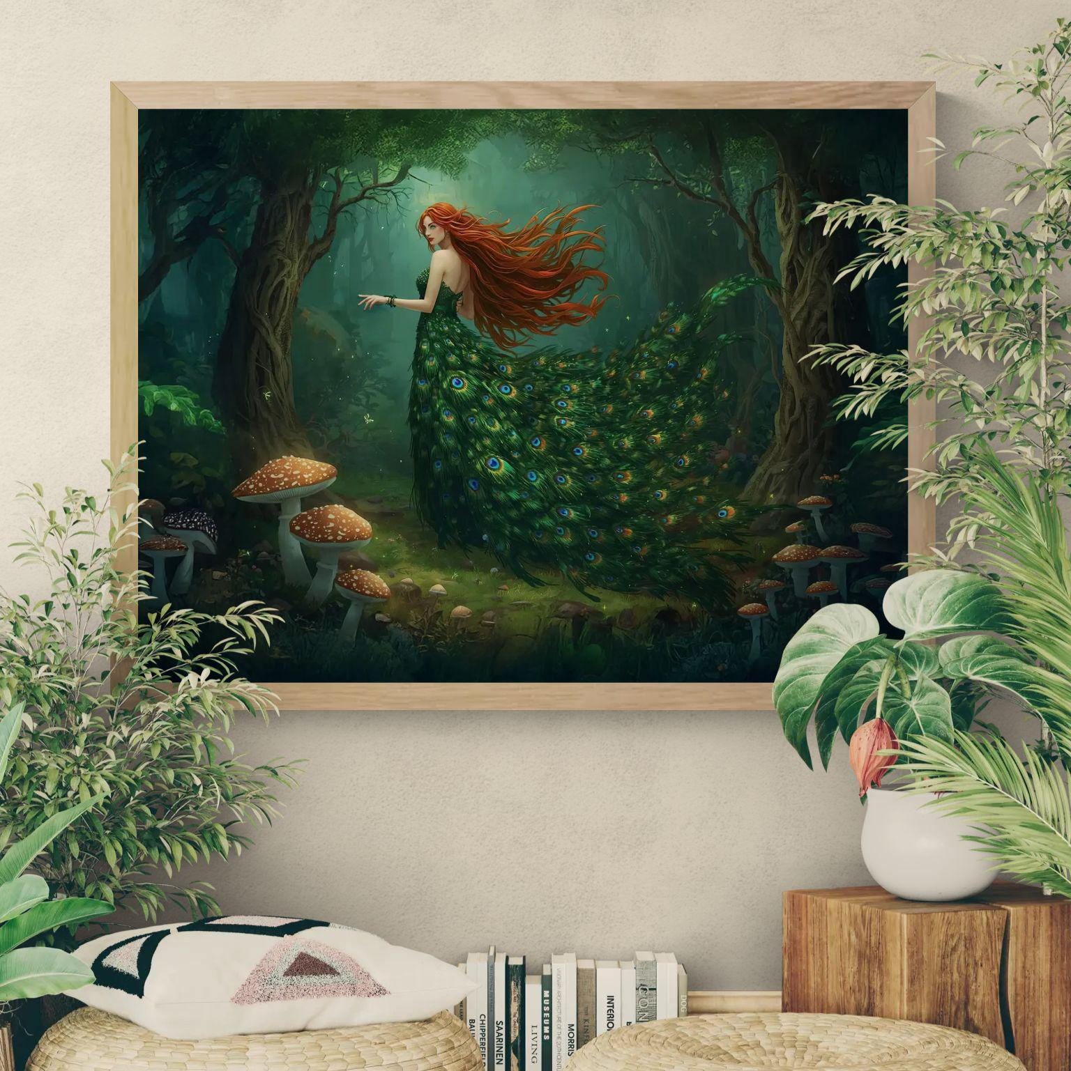 This peacock goddess wall art showcases a mythical forest woman adorned in flowing emerald feathers and timeless elegance. Designed for fantasy decor lovers, this artwork brings mystery, grace, and nature-inspired magic into any space.