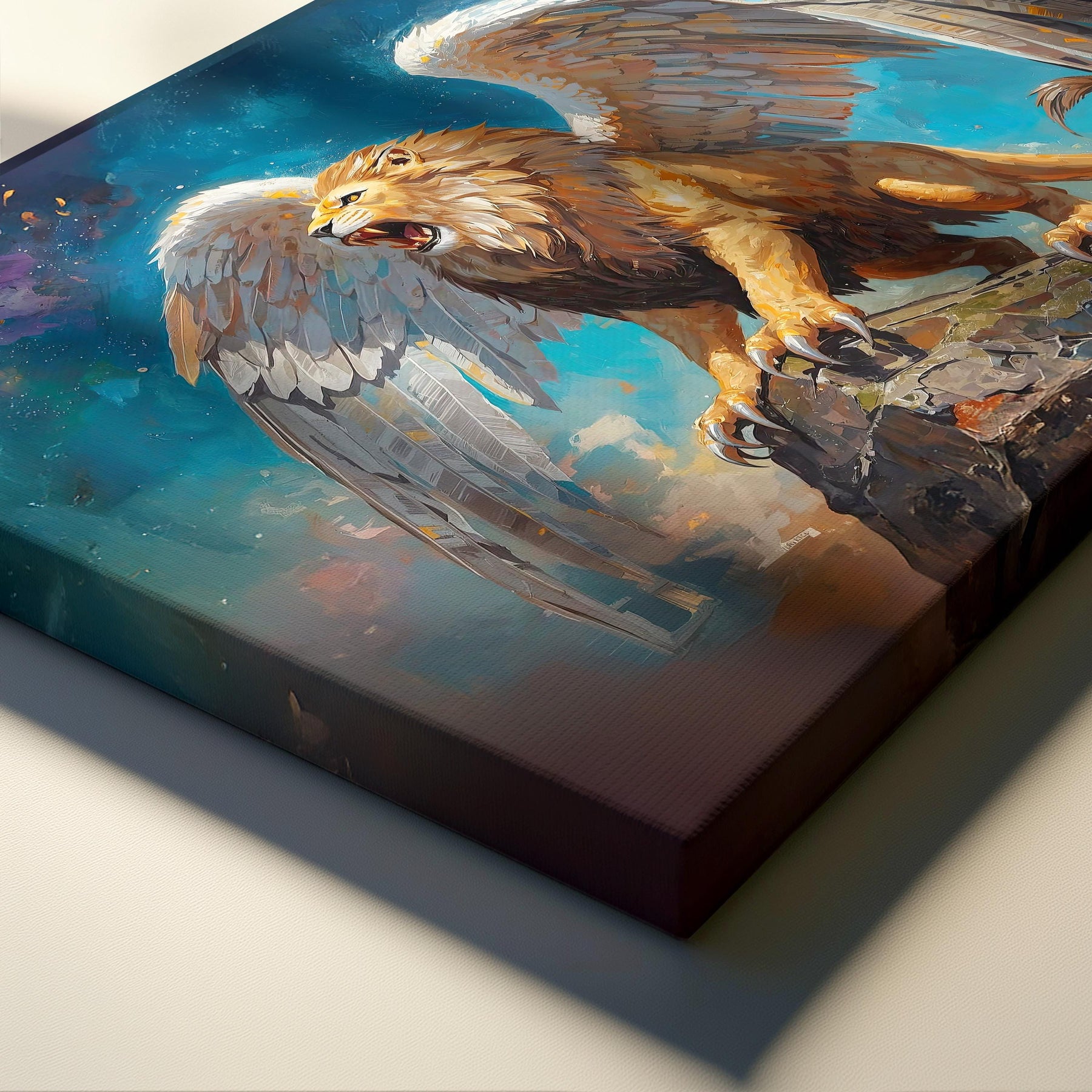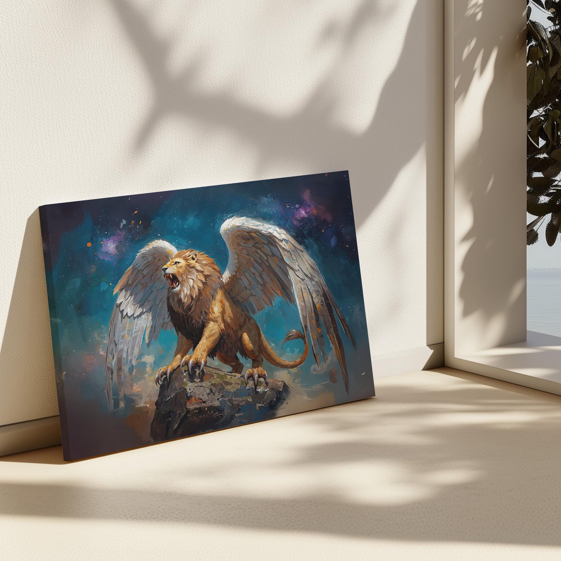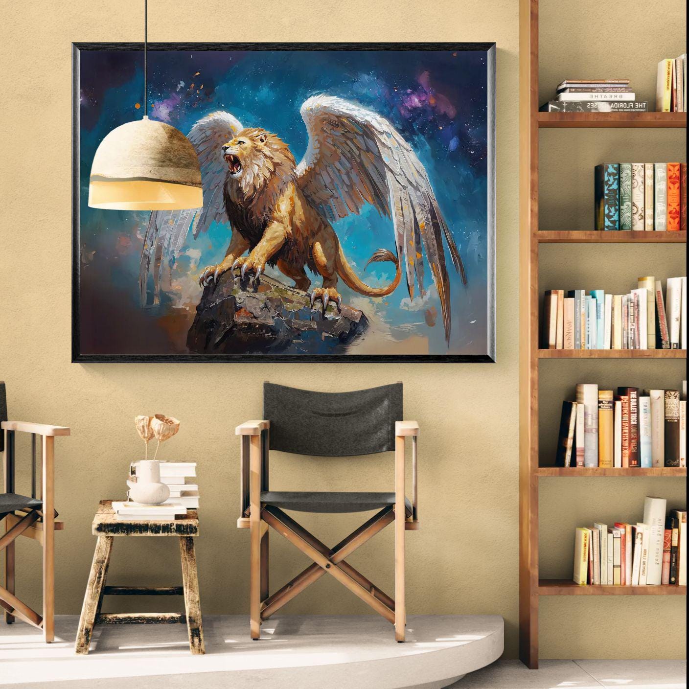 This winged lion wall art portrays a powerful mythical guardian standing atop stone, wings spread in defiance and strength. Designed for fantasy decor lovers, this dramatic artwork brings courage, protection, and epic presence into any space.