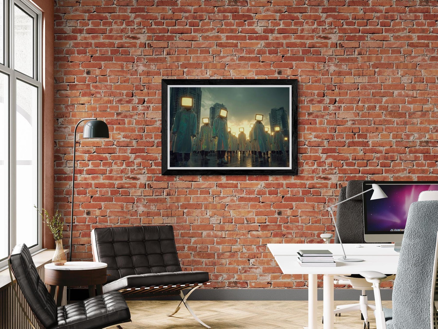 Enter a surreal world where faceless figures with glowing retro television screens for heads roam through a futuristic city at sunset. This retro futurism wall art blends nostalgia, sci-fi, and surreal storytelling into a bold visual statement.