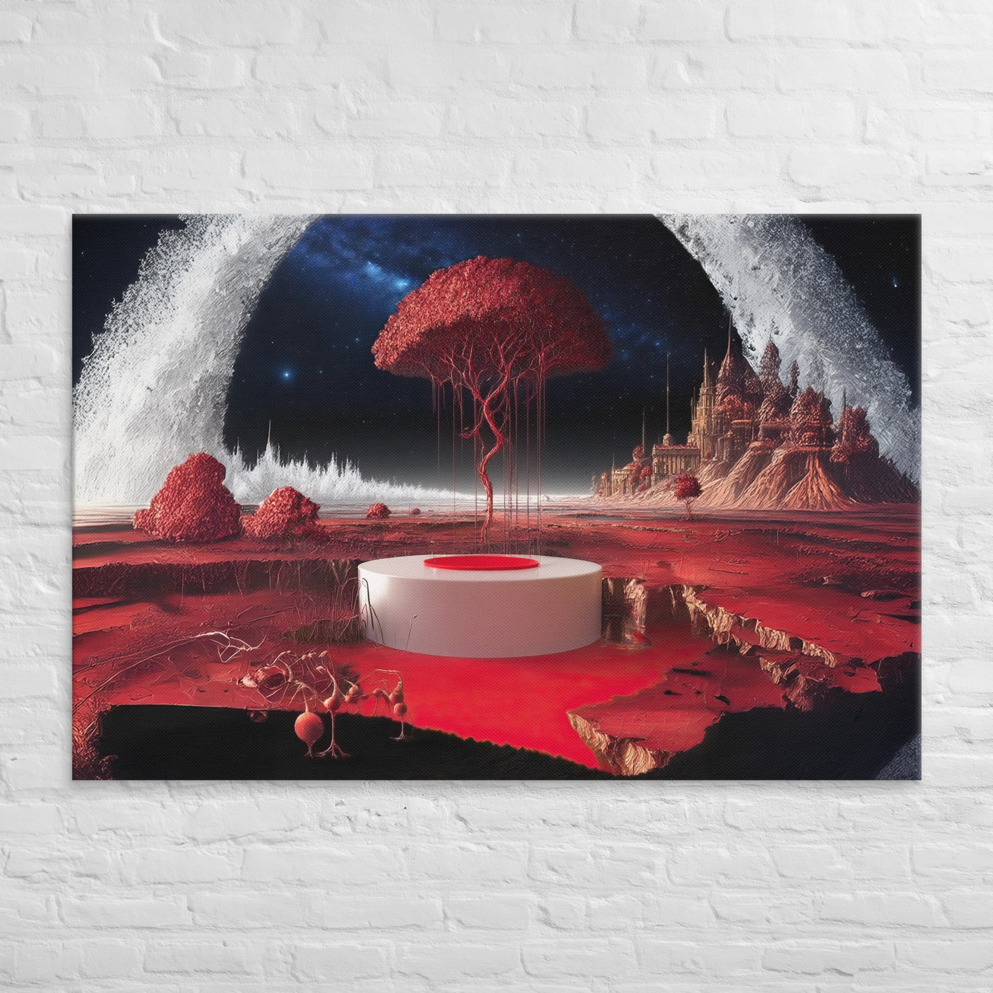 Elevate your walls with this surreal red dreamscape canvas. Choose your perfect size today and bring cosmic artistry into your home.